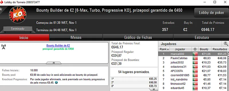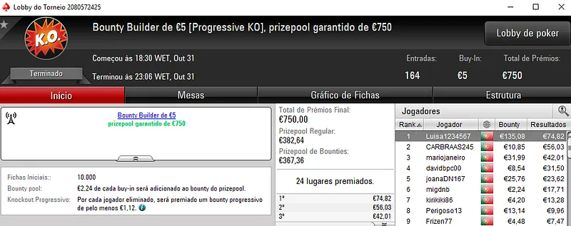 CelestinoJ foi recebendo bounties no Super Tuesday Battle €30 para levar para casa €1,167 de recompensa. O torneio contou com 211 participantes e no segundo posto, tribetes10 encaixou €662. Já 20BV20 faturou €432 na terceira posição.