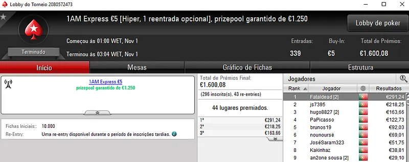 Para terminar, o Super Tuesday Midnight Express €20 contou com a vitória de MegasLvLUP que embolsou €1,010 de prémio. Ele venceu pretopolaris no heads-up, que faturou €757. A fechar o pódio, Birilu recebeu €568.