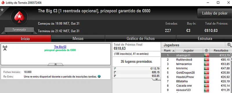 O campeão do The Big €20, drOppzPT também teve direito a €1,015 de recompensa depois de ultrapassar o field com 311 entradas. No segundo posto, vicenT_V1337 que venceu o The Hot BigStack Turbo €50, faturou mais €761. Já brunamarisa9 levou para casa €571 no terceiro posto do pódio.