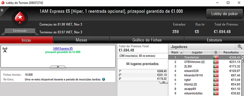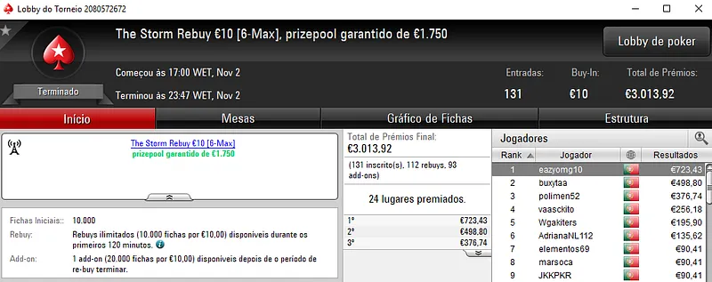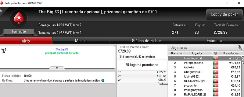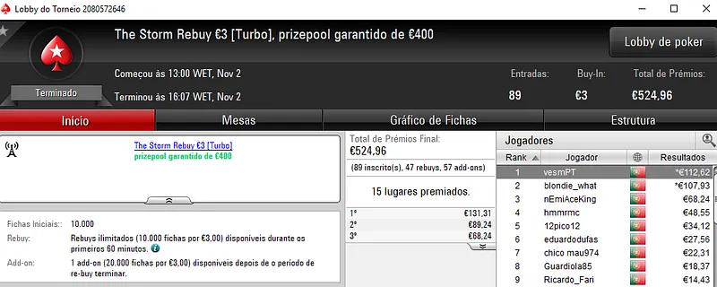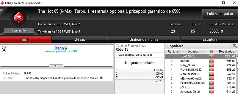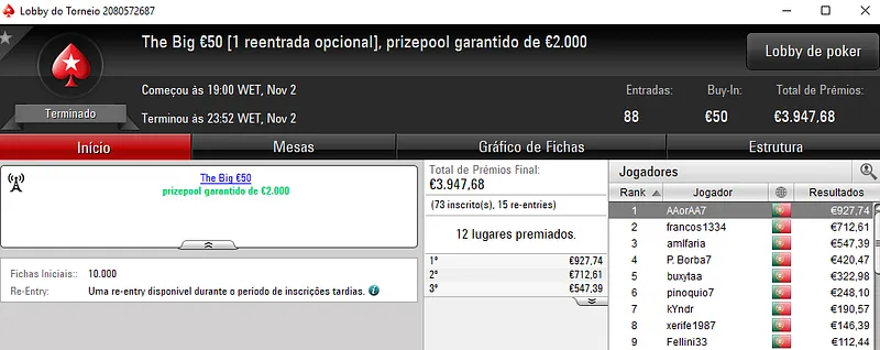 Fábio "wannab333" Dâmaso foi o grande vencedor ao conquistar o The Hot BigStack Turbo €50 e ainda sair com o segundo lugar no The Big €100. No total, faturou mais de 2,700 na sala de poker online.