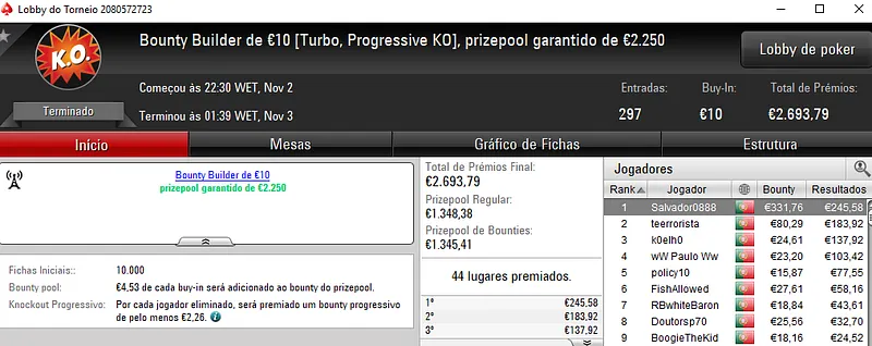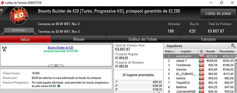 O Bounty Builder €30 também entregou um prémio de 4 dígitos. GivMeYrCh1ps levou para casa €1,055 entre prémio e bounties. O torneio teve a participação de 144 jogadores e o segundo posto ficou reservado a SimplesGame que recebeu €408 de prémio. Já Kito98XT levou para casa €282 na terceira posição.