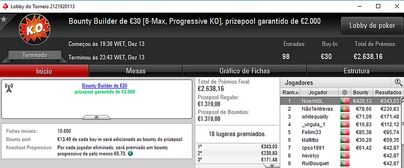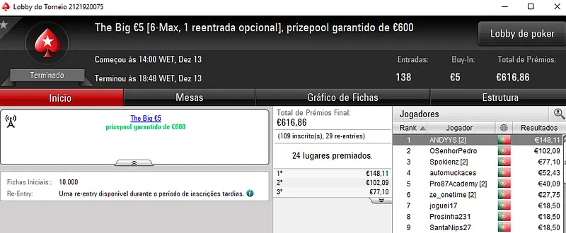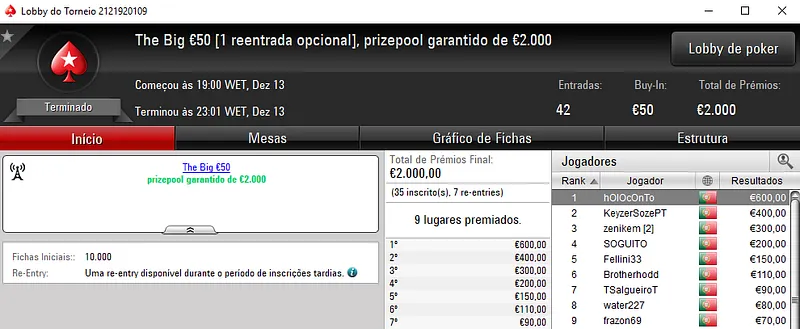 O maior prémio do dia foi parar à conta de famaguda01 que se sagrou campeão do The Big €100 com 48 entradas e €4,351 de prize pool. Recebeu €1,305 de recompensa. O segundo classificado, obisgas embolsou €870, enquanto ivanildo no terceiro posto faturou €652. Apenas seis jogadores tiveram direito a prémio neste torneio.