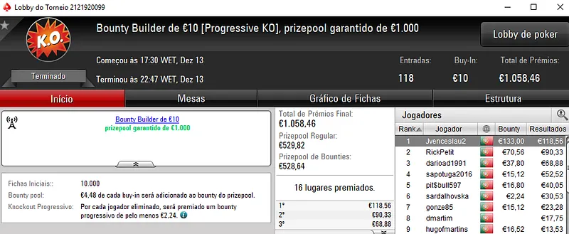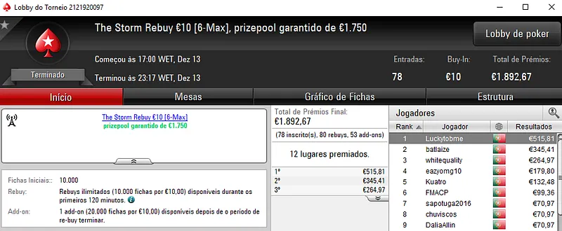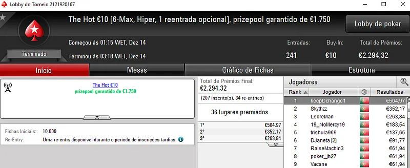 Já o The Hot BigStack Turbo €50 registou 140 entradas que se traduziram em €6,346 de prémio. Os dois finalistas decidiram dividir os prémios no heads-up e assim, Tlitado e jgrhajsj receberam €1,286 cada um. O terceiro lugar ficou reservado para Serahnnil que levou para a sua caixa €793 de prémio.