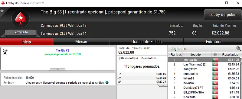 A sessão de quarta-feira trouxe um registo mais normal à sala de poker online nacional, com apenas 3 jogadores a saírem com prémios de 4 dígitos. Como é habitual, esses prémios foram entregues no The Big €100 e no The Hot BigStack Turbo €50.