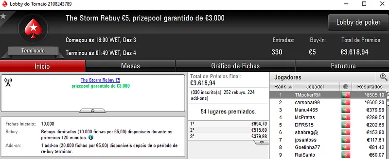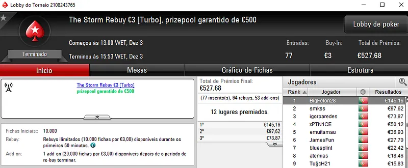 O The Storm Rebuy €10 viu allinfinity sair com €1,196 de prémio, depois de ganhar o torneio com 236 jogadores. Na segunda posição, jmmpc teve direito €834 e Alexxnuts levou €625. Este torneio contou com um prize pool €5,435.