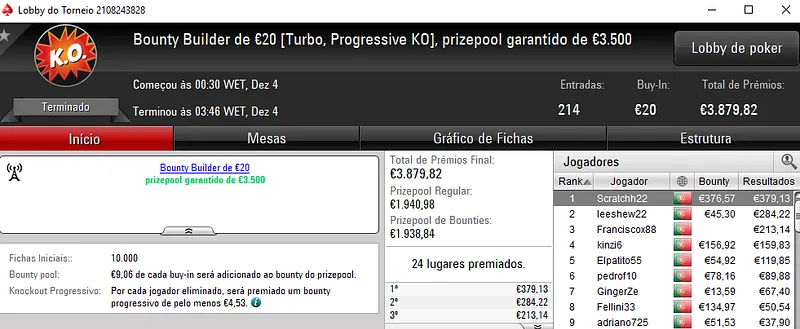 Para terminar, xunekas23 conquistou o The Big €20 com 341 entradas e €6,120 de prize pool. Pelo triunfo, recebeu €1,113 deixando Suduaya com €834 na segunda posição. A fechar o pódio, xaneta7 encaixou €626 de prémio.