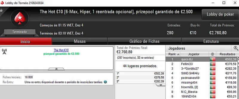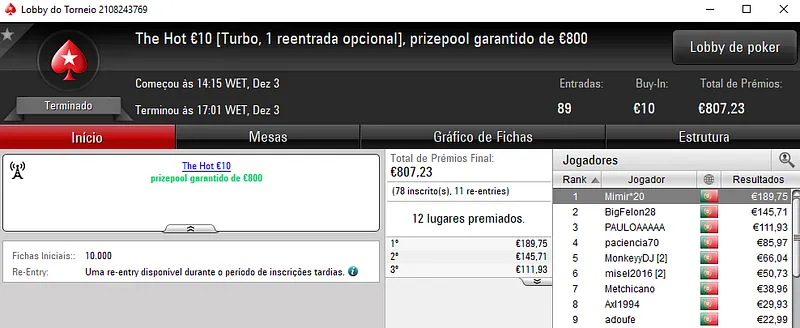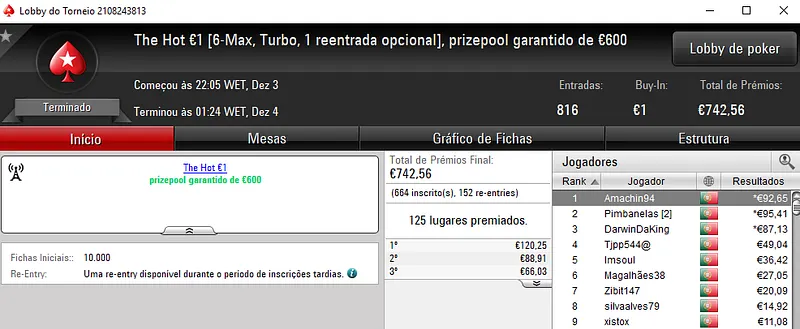 Afonso Palma "4336idoloscp" Ferro conquistou o The Hot BigStack Turbo €50 e recebeu €2,106 de prémio. Este torneio contou com 202 entradas que resultaram num prize pool de €9,156. No segundo posto, GJRF5 embolsou €1,465, enquanto a fechar o pódio nunocassamo recebeu €1,098.