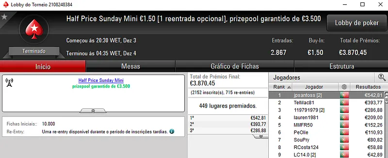 O Half Price Sunday Midnight Express €10 também trouxe mais um prémio de 4 dígitos. As 886 entradas registadas resultaram num prize pool de €7,947. Com a maior fatia do bolo, stephent1ltt arrecadou €1,263 depois de vencer sab3ap4t0 no heads-up (€932). Na terceira posição, rafa_oli25 embolsou €688.