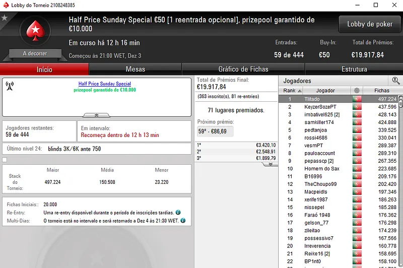 O Half Price Sunday levou muitos jogadores para as mesas de poker online da PokerStars.pt e isso resultou em 12 prémios acima dos mil euros entregues pela sala de poker. Conhece aqui abaixo os maiores vencedores do dia.