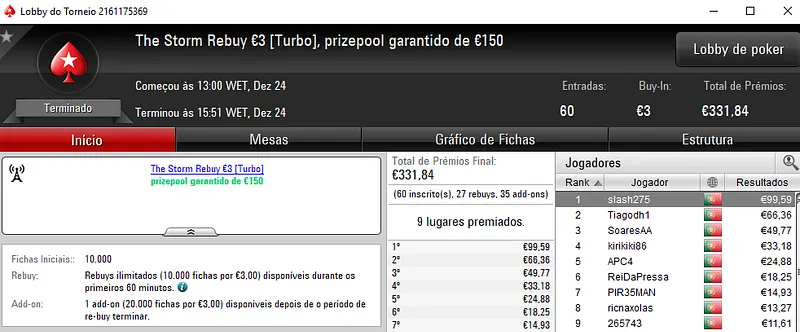 Mesmo assim, o The Hot BigStack Turbo €50 acolheu 71 entradas e o prize pool foi 3 vezes superior aos €1,000 garantidos. Os prémios foram repartidos pelos 12 melhores classificados, com o heads-up a trazer também a divisão dos prémios em jogo. PT Rainmaker e prozongo levaram para as suas contas €732, cada um. Já o terceiro posto ficou reservado a km206 que faturou €450.