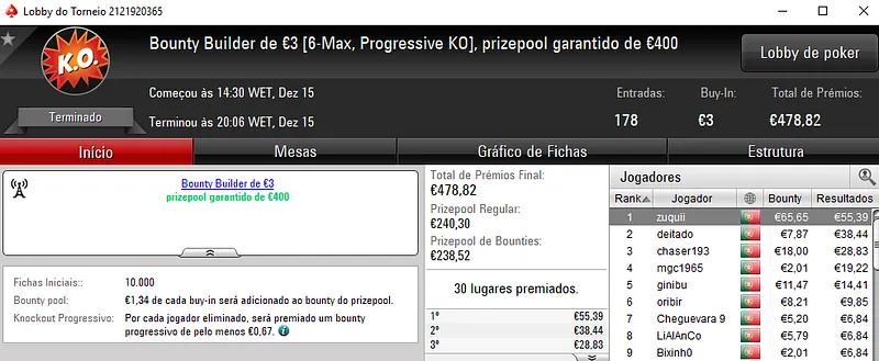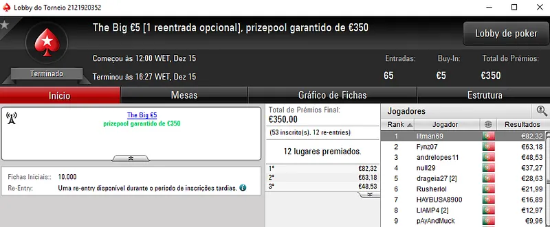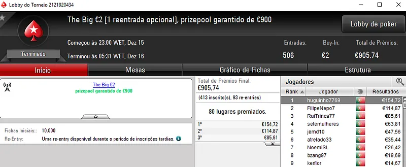 Já o The Big €100 contou com apenas 37 registos que se traduziram em €3,354 de prize pool. Com 9 jogadores a receberem prémios, ecardigo foi quem teve direito à maior fatia e amealhou €1,006. Macpeidls perdeu no heads-up e levou €670 de recompensa. A fechar o pódio, drOppzPT teve direito a €503.