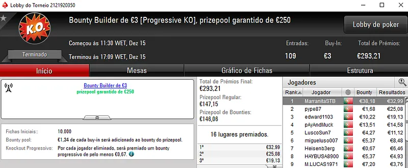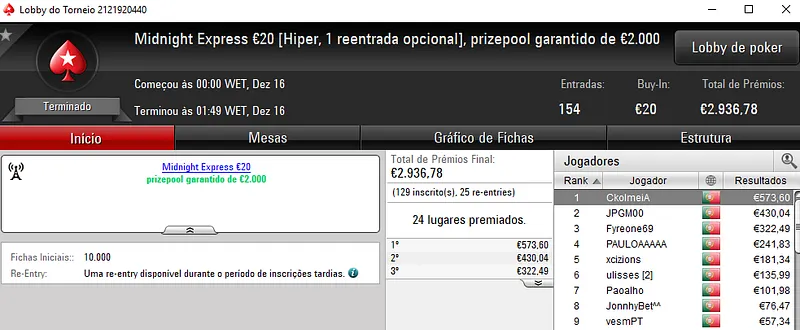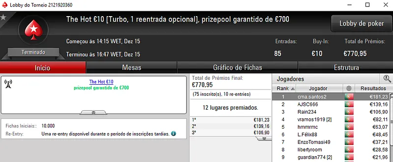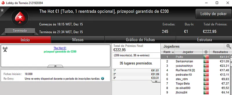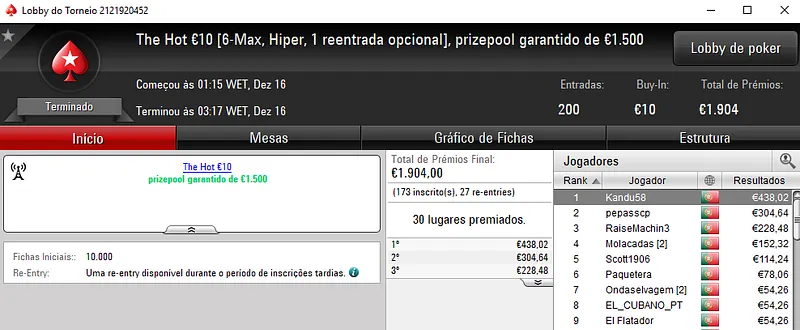 O The Hot BigStack Turbo €50 voltou a ser bastante participado e registou 116 entradas, com o prize pool a chegar aos €5,258. Com o título, quico.BJ arrecadou o maior prémio do dia ao receber €1,367. No segundo posto, FlyStone23 levou para casa €920, enquanto RuiBouquet faturou €683 no terceiro lugar da classificação.