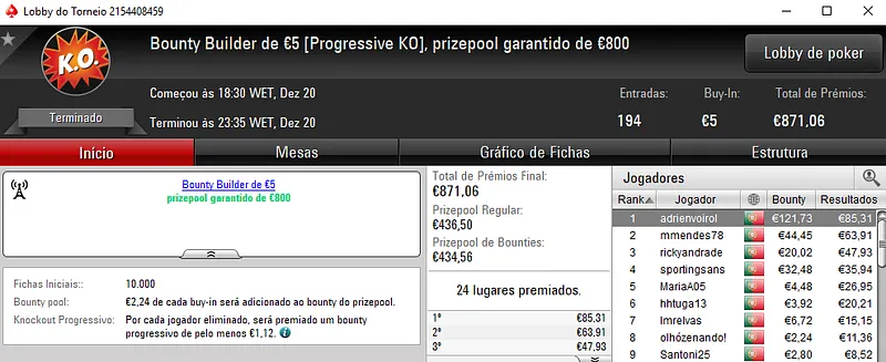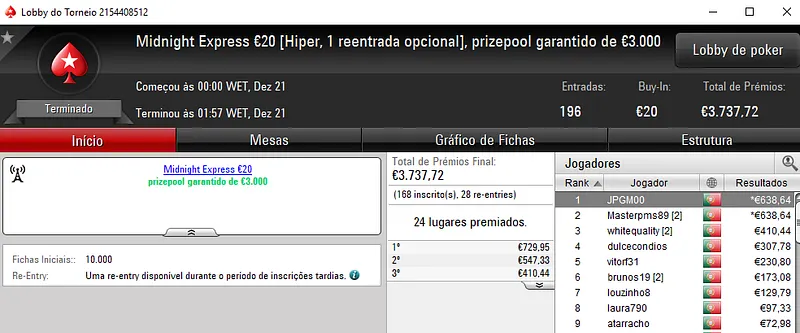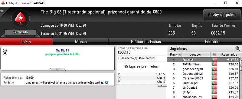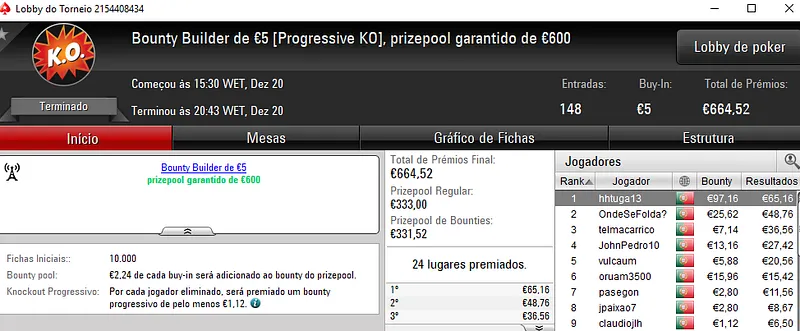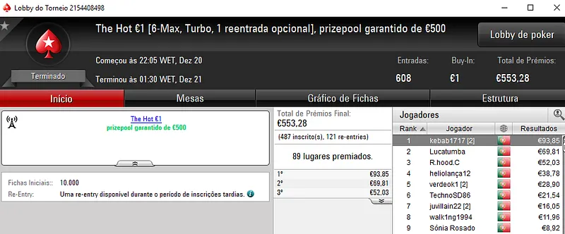 Com 120 entradas, o The Hot BigStack Turbo €50 não suplantou o prize pool garantido de €5,500, que foi assim repartido pelos 18 melhores classificados. No topo da classificação, RgonzalezM95 arrecadou €1,430 de prémio. Masterpms89 perdeu no heads-up e arrecadou €962, enquanto OOdeio terminou no terceiro lugar e recebeu €715.