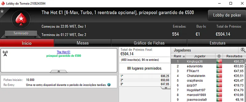 As 113 entradas registadas no The Hot BigStack Turbo €50 perfizeram um prize pool total de €5,122 que foi repartido pelos 18 melhores classificados. O heads-up foi disputado por linoviseu25 e JMPomba que chegaram a acordo e dividiram os prémios em partes iguais, €1,114 para cada um. Bartolini01 foi terceiro classificado e recebeu €665.