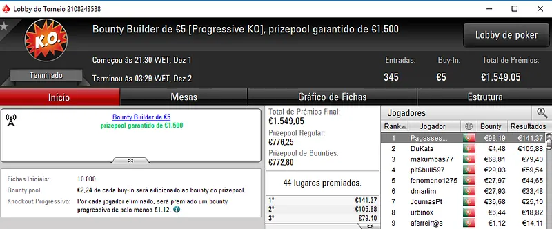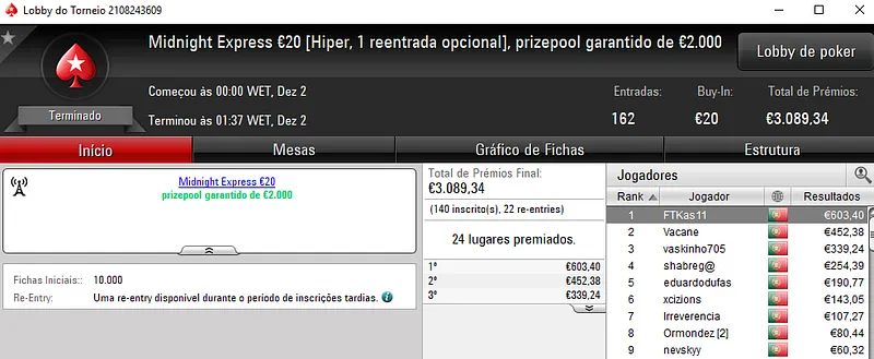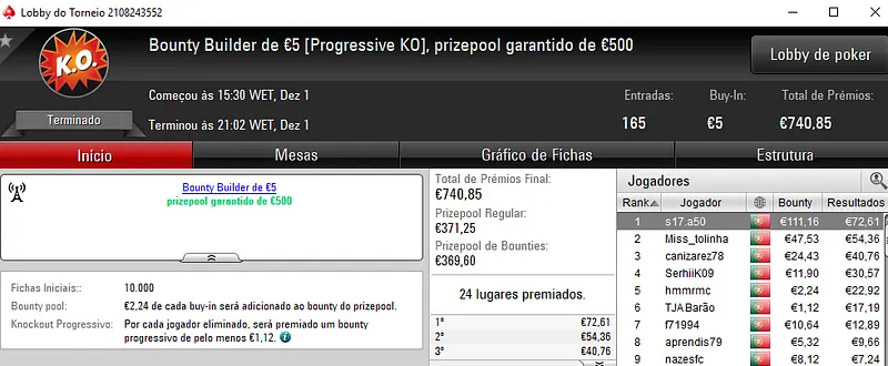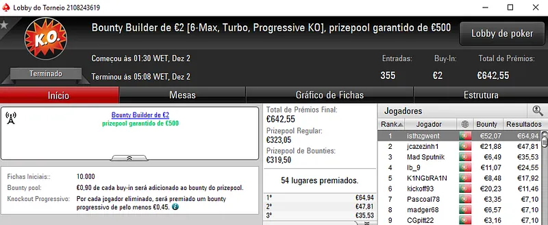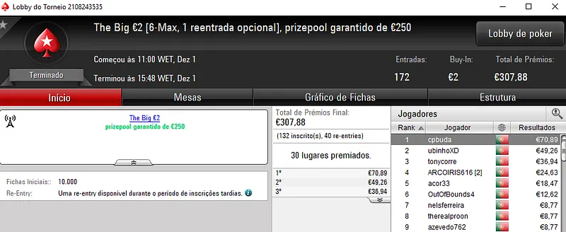 Já o The Big €100 contou com 30 entradas registadas e €2,719 de prize pool. Com prémio para os seis melhores classificados, Rui "RuiBouquet" Bouquet foi o campeão e embolsou €1,006. O segundo lugar ficou para AAEUKK que levou para casa €679, enquanto vaasckito encaixou €407 na terceira posição.