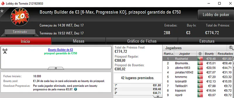 O Sunday Battle €30 viu entrarem em jogo 302 jogadores, onde bombacrm derrotou o field para encaixar €1,648 entre prémio e bounties. No segundo posto, R_PokerSt@rs levou €1,108, enquanto baptista136 teve direito a €490 no terceiro lugar.