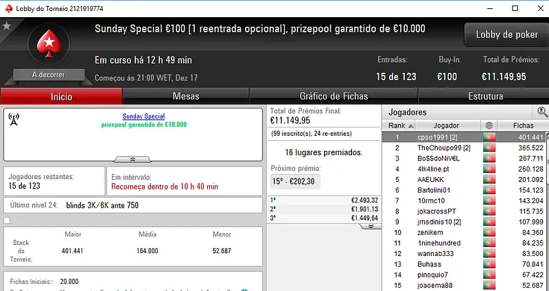 Hoje realiza-se o dia 2 do Sunday Special €100, em jogo estão mais de €11 mil.