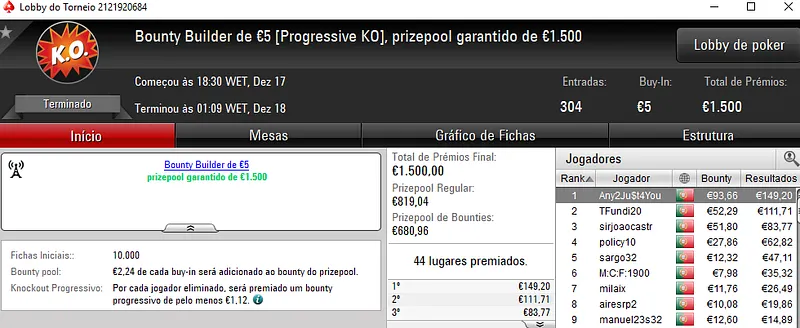 Já no fim da noite, o Sunday Midnight Express €20 contou com 375 entradas e €7,151 de prize pool. Os prémios foram divididos no heads-up, com 420benfas a receber €1,118 e o título, e mtuga07 a arrecadar €1,075 no segundo posto. APCOSTA terminou em terceiro e recebeu €705.