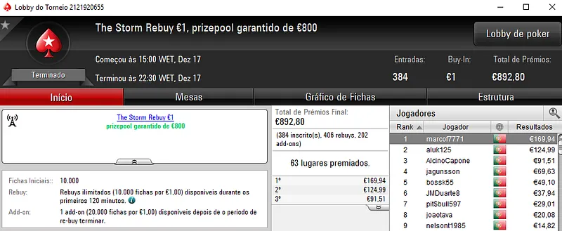 O The Storm Rebuy €10 acolheu 216 jogadores que realizaram 175 rebuys e 148 add-ons. Contas feitas e o prize pool de €4,834 foi repartido pelos 36 melhores jogadores, onde catanho_21 embolsou €1,063. Na segunda posição 4336idoloscp teve direito a €742 e TabordaPT encaixou €556 no terceiro lugar.
