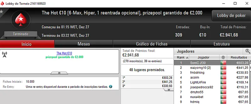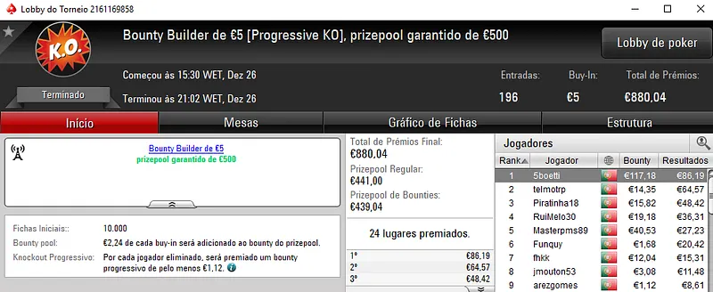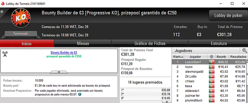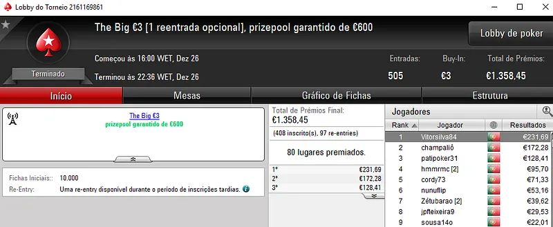 O The Big €20 acolheu 333 entradas que se traduziram em €5,977 de prize pool. O campeão foi capixaba25 que encaixou €1,087 pelo título. Já Salvador0888 terminou no segundo posto e amealhou €815. A fechar o pódio, MissSensação teve direito a €611 de prémio.