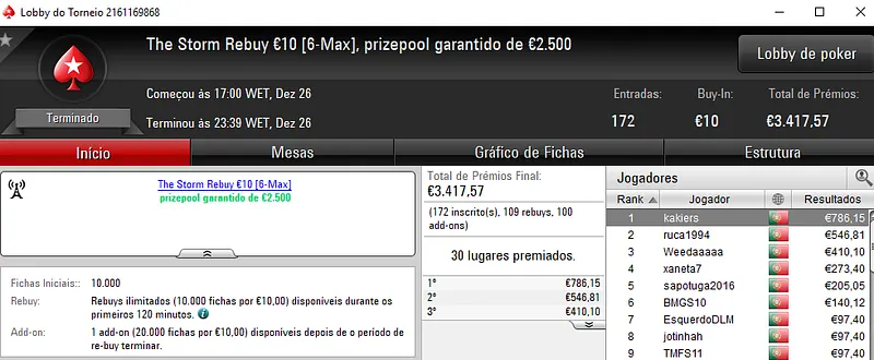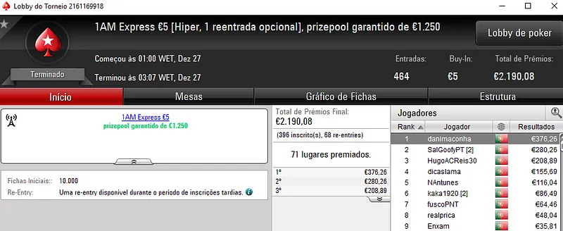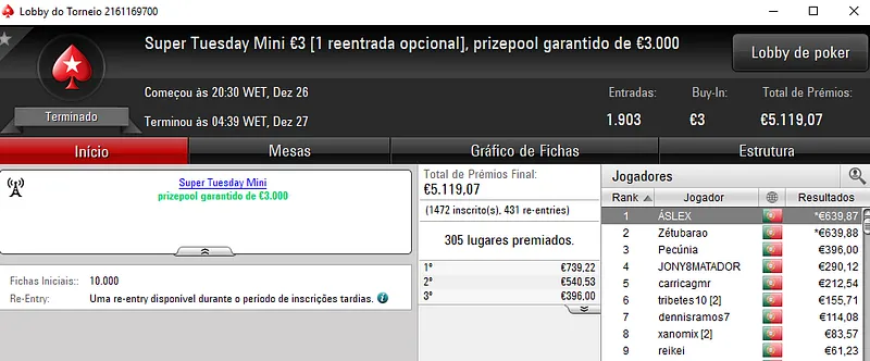 Para terminar, o Super Tuesday Midnight Express €20 viu dois jogadores saírem com mais de mil euros de prémio. Bartolini01 e lukynumber13 dividiram os prémios no heads-up e levaram €1,004, cada um. No terceiro lugar, street681 teve direito a €645. Este torneio contou com 331 entradas e €6,312 de prize pool.