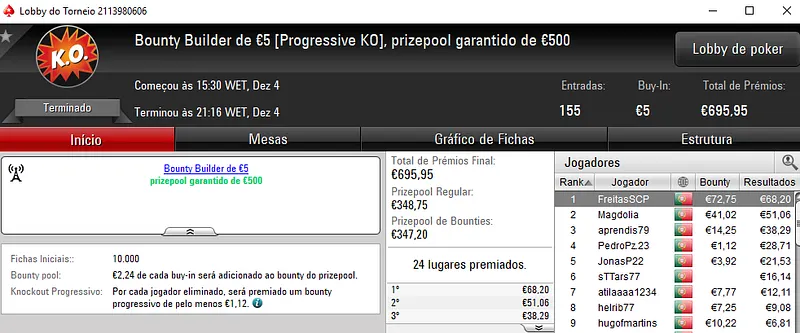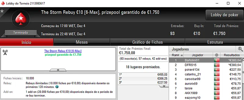 GANDI[FCP] sagrou-se campeão do Half Price Sunday Storm €5 para embolsar €1,698 de prémio ente as 2,667 entradas registadas. O heads-up foi disputado contra ze omissirev que foi recompensado com €1,235. A fechar o pódio, nr8flush recebeu €900 de prémio. Este torneio contou com um prize pool de €12,081, onde os melhores 431 jogadores saíram com prémios.