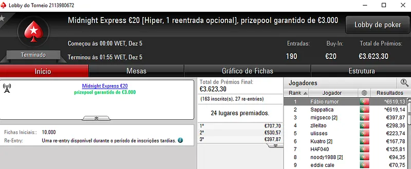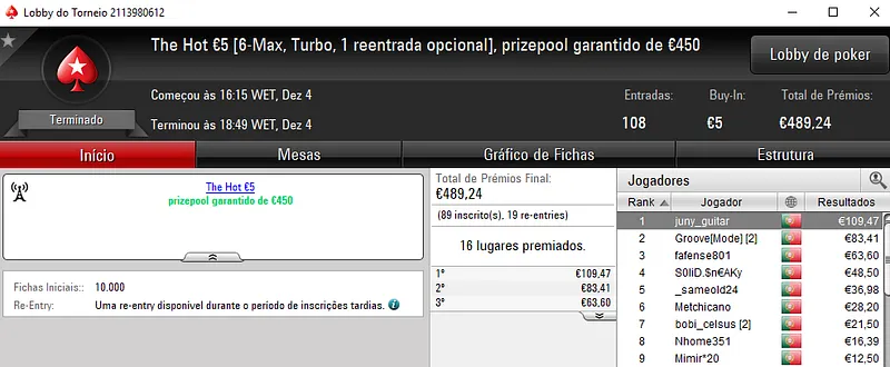 Regressando aos torneios regulares, o The Hot BigStack Turbo €50 registou 144 entradas que perfizeram um prize pool de €6,527. O campeão foi manuelmpc1 que recebeu €1,479, depois de chegar a acordo no heads-up com E_nuno81 que encaixou €1,167 de prémio. RicBG na terceira posição teve direito a €815.