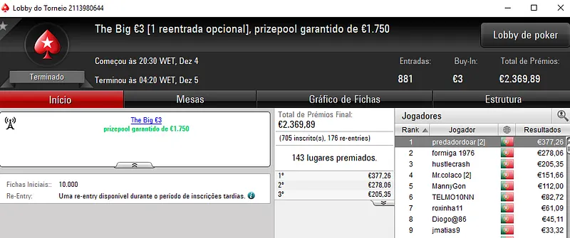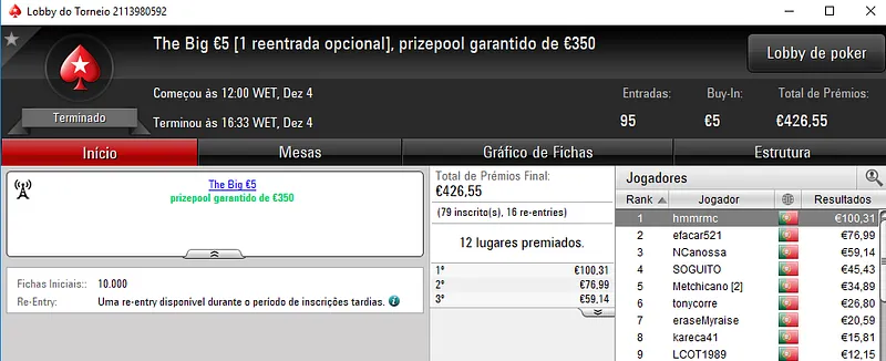 JoséSaram323 foi o campeão do The Big €100 com 49 entradas e €4,441 de prize pool. Ele recebeu o único prémio de 4 dígitos entregue neste torneio, cerca de €1,332. O segundo lugar ficou para pasmasseiro que faturou €888, enquanto SuSanch0 levou €666 na terceira posição.