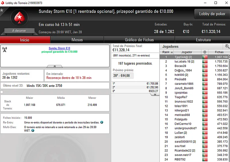 Hoje realiza-se o dia 2 do Sunday Special €100 e do Sunday Storm €10, em jogo estão mais de €21 mil.