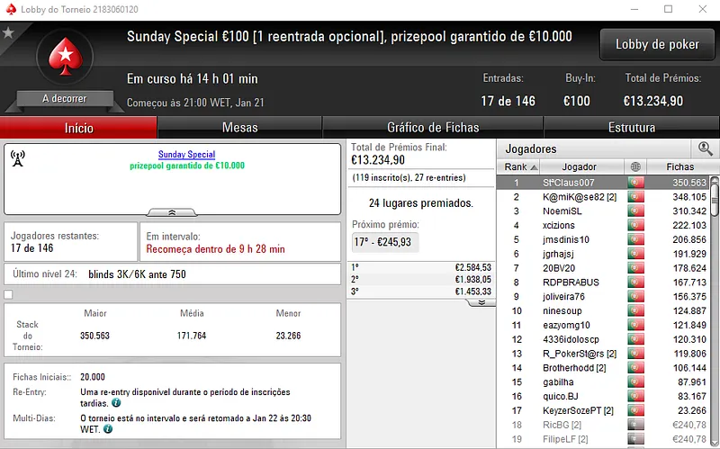 Hoje realiza-se o dia 2 do Sunday Special €100 e do Sunday Storm €10, em jogo estão mais de €24 mil.