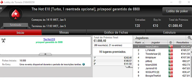 O The Hot BigStack Turbo €50 acolheu 144 entradas que se traduziram em €6,527 distribuídos pelos 24 melhores classificados. O campeão foi NeverLoose62 que levou para a sua conta €1,566 de prémio. O heads-up foi disputado contra TKKKK05 que teve direito ao segundo prémio de 4 dígitos da noite, cerca de €1,080. Já o último lugar do pódio ficou reservado para RDF71 que recebeu €815.