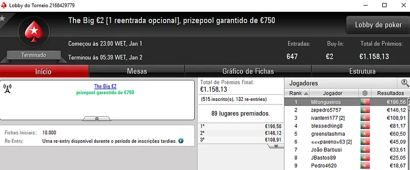 Já o The Big €20 acolheu 339 entradas e o prize pool chegou aos €6,085. Com o título de campeão Fellini33 embolsou €1,107 de prémio. vmelo29 perdeu no heads-up e encaixou €830. O pódio fica completo com NeverLoose62 na terceira posição para €622.