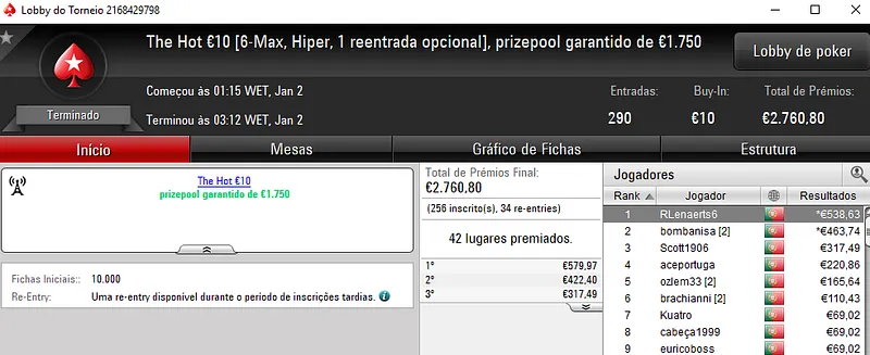 Com 186 entradas, o The Hot BigStack Turbo €50 contou com um prize pool total de €8,431, a ser dividido pelos 30 melhor classificados. Com o título Prey223 levou para casa o maior prémio da sessão, cerca de €1,939. Na segunda posição, fmbdrking teve direito a €1,349, enquanto Bartollini01 amealhou €1,011 com a medalha de bronze.