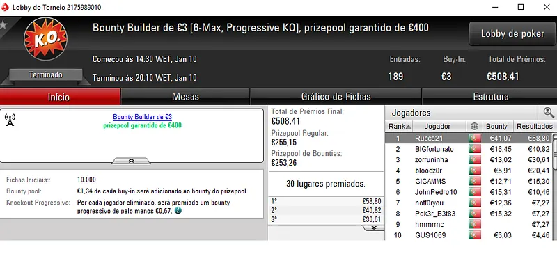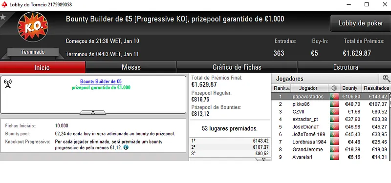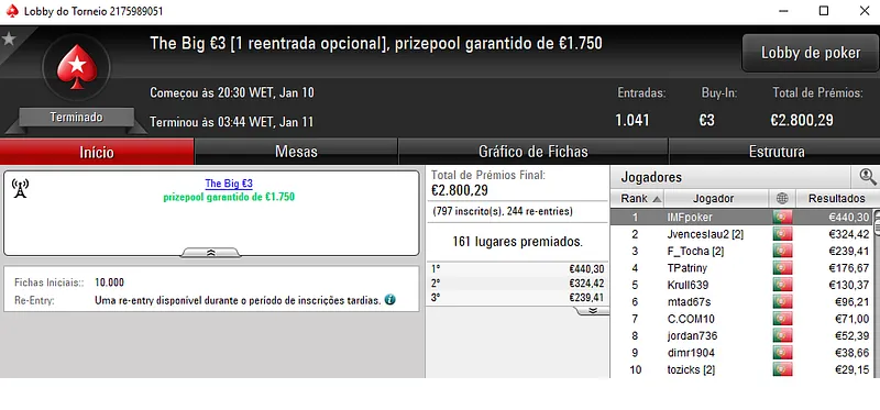 Já o The Big €100 com 44 entradas e €3,988 de prize pool viu Prey223 sair com o prémio de campeão. O título valeu €1,196 depois de vencer pi$toleiro no heads-up, que encaixou €797. O terceiro posto ficou para kakiers que faturou €598.