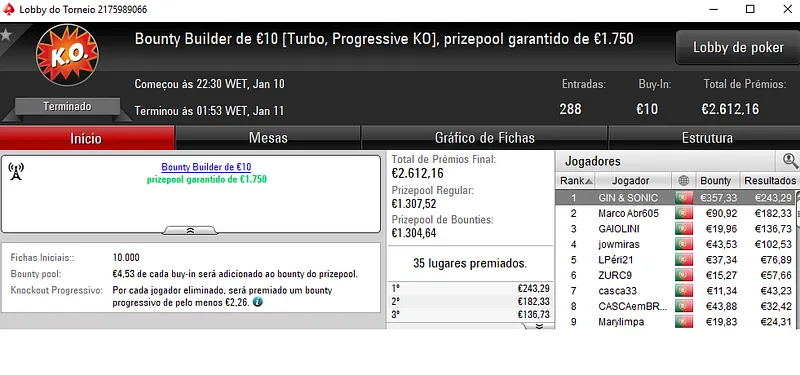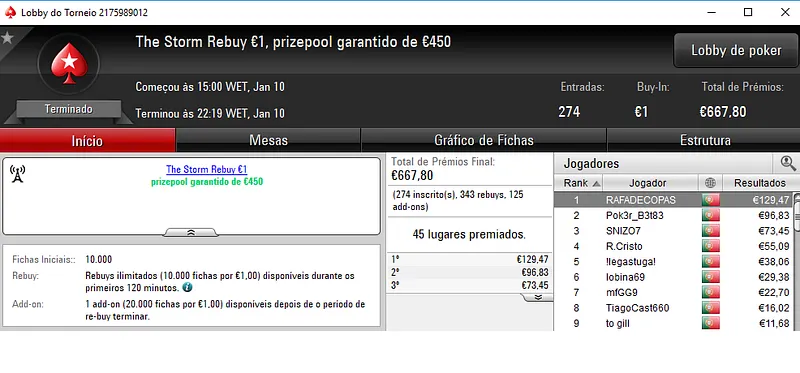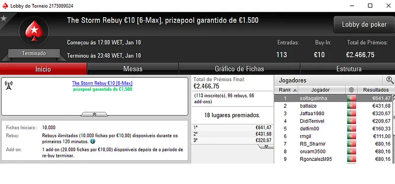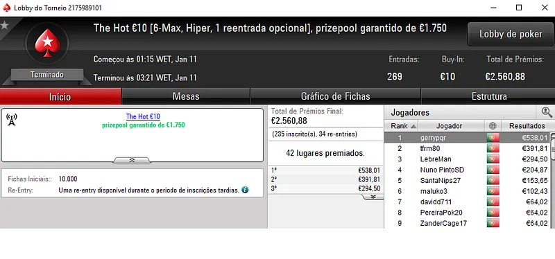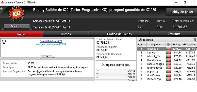 O campeão do The Hot BigStack Turbo €50 foi sdajwqeo que embolsou €1,621, depois de deixa para trás o field com 149 entradas. Na segunda posição, ascnrh levou para a sua conta €1,117 dos €6,754 de prize pool distribuído. A fechar o pódio 4lk4line.pt teve direito a €844 de recompensa.