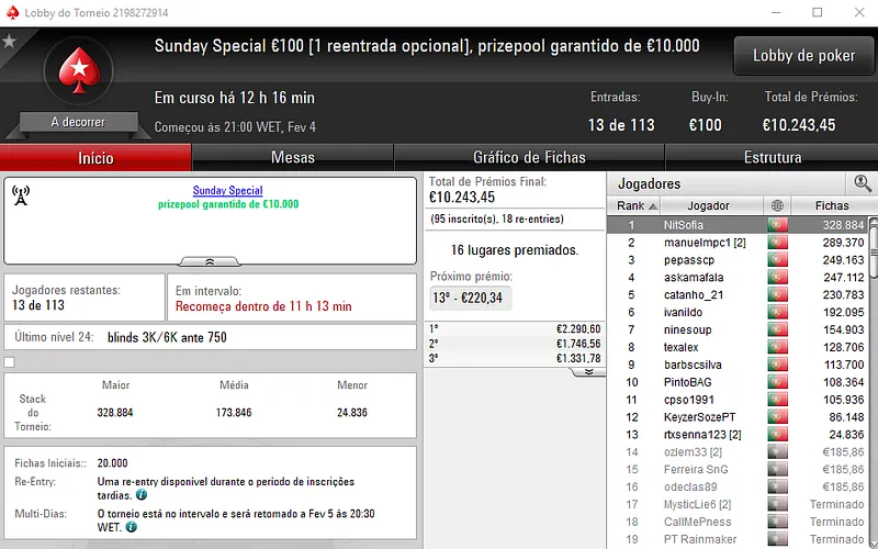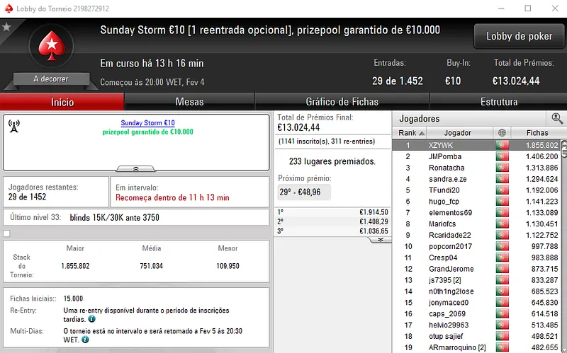 Hoje realiza-se o dia 2 do Sunday Special €100 e do Sunday Storm €10, em jogo estão mais de €23 mil.