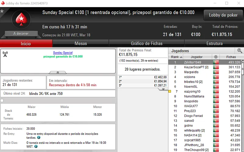 Hoje realiza-se o dia 2 do Sunday Special €100 e do Sunday Storm €10, em jogo estão mais de €24 mil.