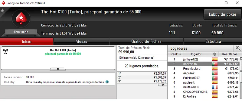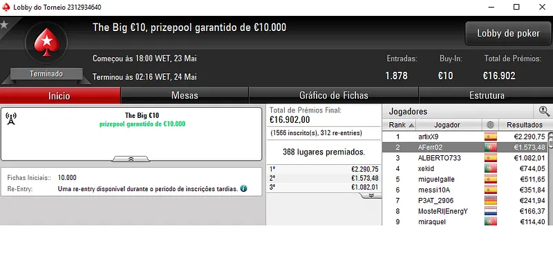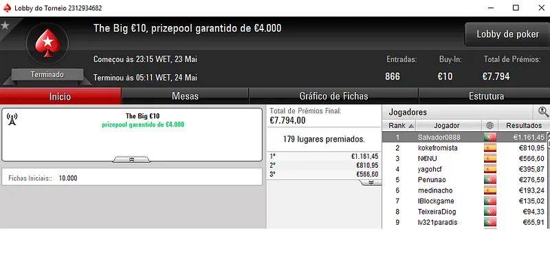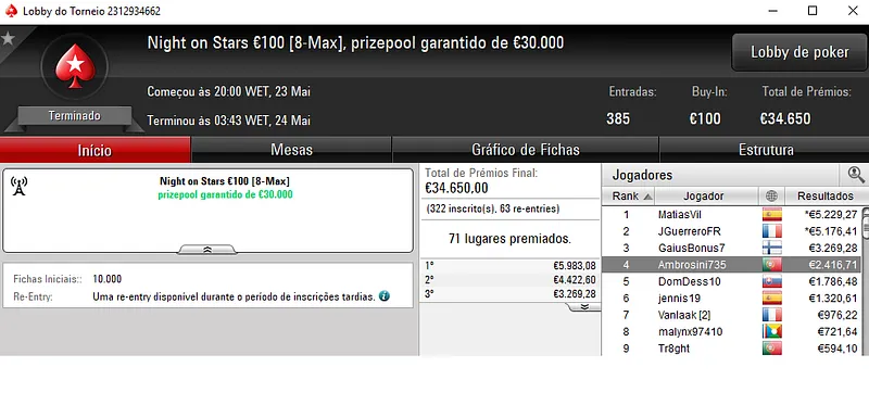 Portugal ficou perto do pódio no Night on Stars €100, um dos torneios de destaque deste mercado. Ambrosini735 embolsou €2,416 com o quarto posto no torneio. Foram registadas 385 entradas neste evento que distribuiu €34,650 de prize pool pelos 71 melhores classificados.