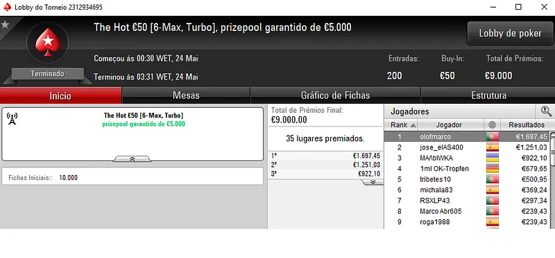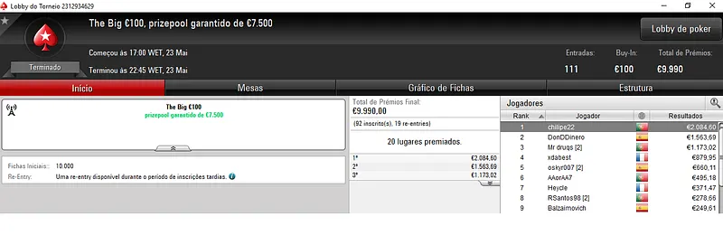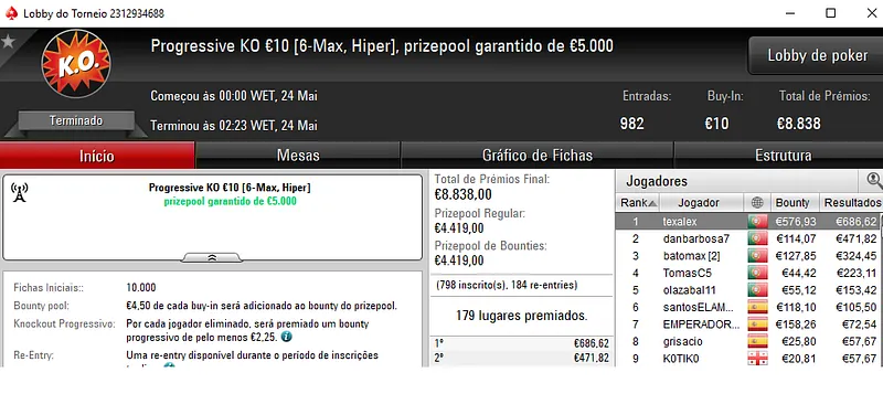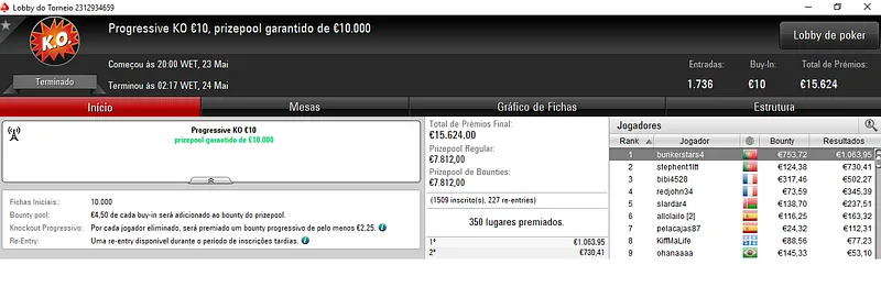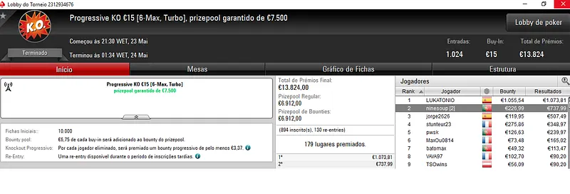 O grande vencedor do dia foi James1893 que se sagrou campeão do Progressive KO €50 com 545 jogadores. O jogador luso esteve em grande plano e depois de despachar toda a concorrência embolsou €3,481, entre prémio e bounties. O prize pool deste evento ascendeu aos €24,525.