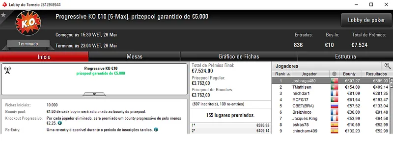 Outro título luso apareceu com a vitória de pmbm1995 no Afternoon on Stars €50 com 276 jogadores. O jogador luso superou toda a concorrência para levar para a caixa €2,569 de prémio. Este torneio teve um prize pool de €12,420.