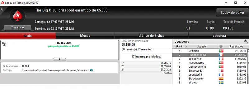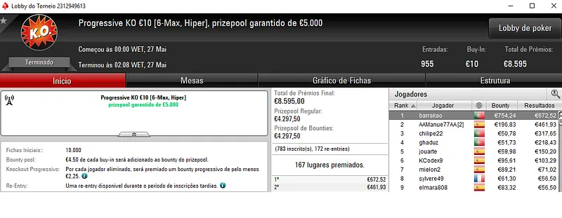 Pedro "jgrhajsj" Cabeça foi quem mais recebeu ao encaixar dois grandes resultados. O maio apareceu com a vitória no Night on Stars €100 com 248 entradas. O prize pool chegou aos €22,320 e o prize pool foi repartido pelos 47 melhores classificados. Cabeça embolsou €4,066 pelo título.