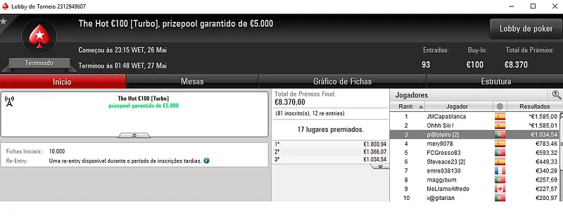 O The Hot BigStack Turbo €50 viu serem registadas 400 entradas, onde o prize pool de €18,000 foi repartido pelos 80 melhores classificados. O segundo posto deu direito a €2,348 a hhtuga, depois de este ter realizados acordo no 3-handed.