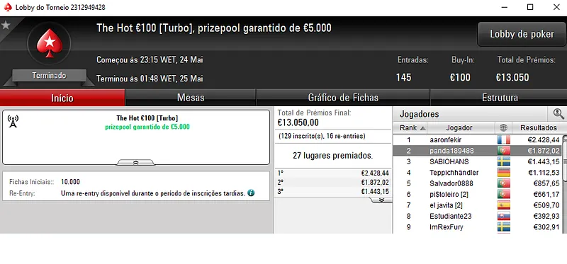 O The Big €100 contou com três portugueses no top 5. O campeão foi chilipe22 que arrecadou €3,029 junto com o título. O torneio contou com 187 entradas e o prize pool de €16,830 foi repartido pelos 35 melhores classificados. A medalha de bronze ainda valeu €1,724 a EvaristAA, enquanto cpso1991 recebeu €1,300 no quarto lugar.