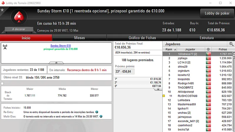 Hoje realiza-se o dia 2 do Sunday Special €100 e do Sunday Storm €10, em jogo estão mais de €20 mil.