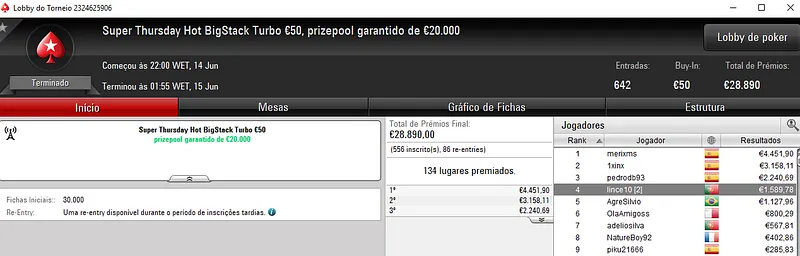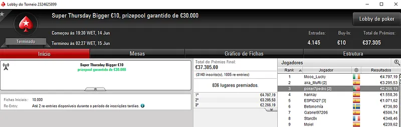 Já TMFS11 e kYndr dividiram os prémios no 3-handed do Super Thursday 6th Sense €10. Com o primeiro posto, TMFS11 embolsou €2,425, enquanto kYndr assegurou €2,505 na segunda posição. Este torneio acolheu 2,969 entradas, onde o prize pool de €26,721 foi distribuído pelos 527 melhores jogadores em prova.