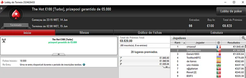 Já a medalha de prata valeu €3,161 a jf_minis. O jogador luso perdeu no heads-up do Super Thursday Midnight Express €20 com 1,708 entradas. Os €30,744 de prize pool acumulado foram distribuídos pelos 295 melhores classificados.