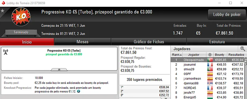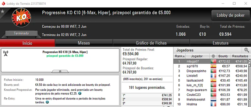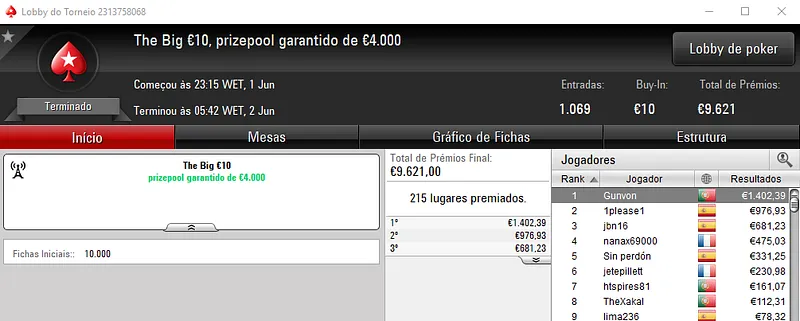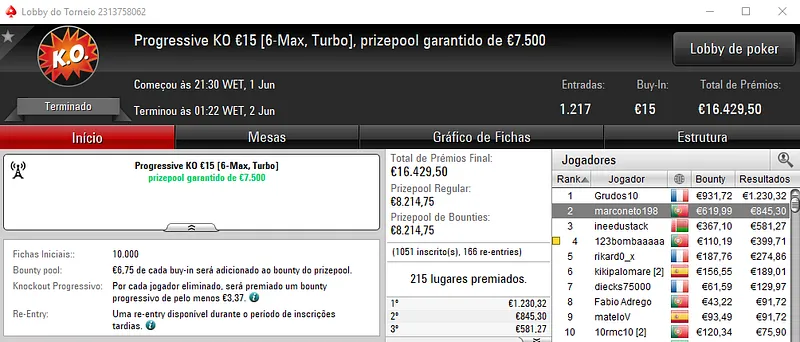Já no Midnight Express €20, MacPeidls voltou a dar nas vistas ao sair com o título e €3,975 de prémio. Este evento contou com 1,525 entradas e o prize pool chegou aos €27,450. Na quinta posição, maroso.pt teve direito a €1,026 de prémio.