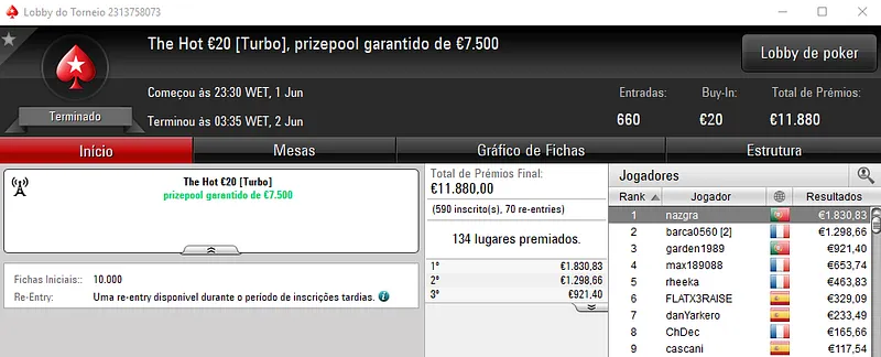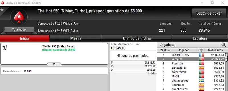 Com 518 entradas, o The Hot BigStack Turbo €50 viu serem repartidos €23,310 pelos 107 melhores classificados. PedrinhasT8 foi segundo classificado e por isso recebeu €2,072 de recompensa.