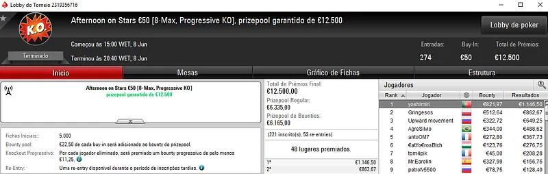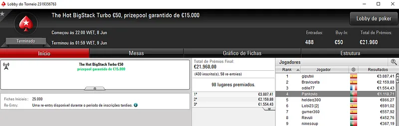 Já no The Big €100 com 72 entradas houve nova dobradinha lusa. Desta vez, o campeão foi eazyomg10 que faturou €1,722 de prémio pelo primeiro posto. Na segunda posição, wannab333 teve direito a €1,205. de prémio.