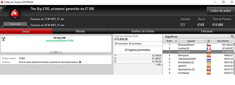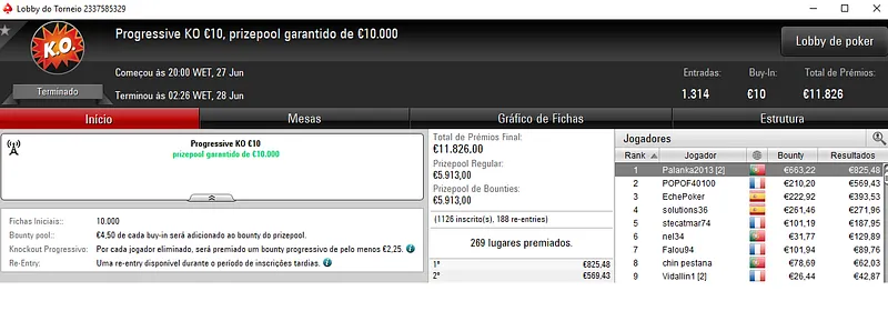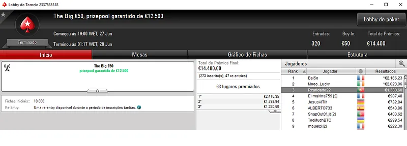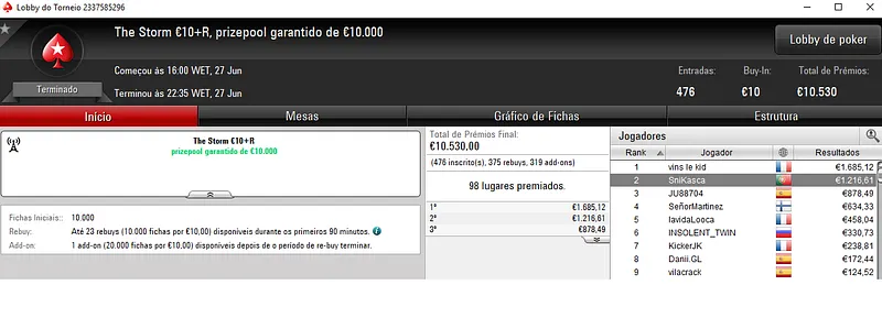 Este evento acolheu 324 entradas que perfizeram um prize pool de €29,160, onde os 55 melhores classificados receberam prémio. TMr.27 sagrou-se campeão deste torneio e teve direito a €5,240 de prémio. Já a medalha e prata rendeu €3,853 a Makukula16 que continua em grande forma no poker online. Com o bronze, NãoTeAtrevas embolsou €2,883 de prémio.